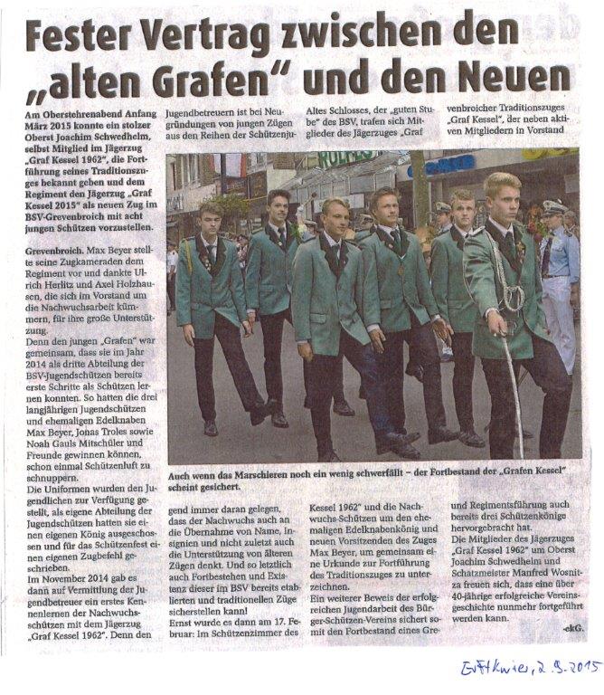 Die beiden BSV-Jugendbetreuer Ulrich Herlitz und Axel Holzhausen werben, auch wenn für die jungen Schützen oftmals im Neuen und Eigenem eines eigenen Jägerzuges der Reiz liegt, auch immer dafür, Namen, Kette und Standarte von Traditionszügen zu übernehmen oder deren Patenschaften in Anspruch zu nehmen. Genauso wie sie immer bei Neugründungen von Zügen für alle im Grevenbroicher Regiment vertretenen Gattungen – seien es die Jäger, Grenadiere oder die Marine – werben.