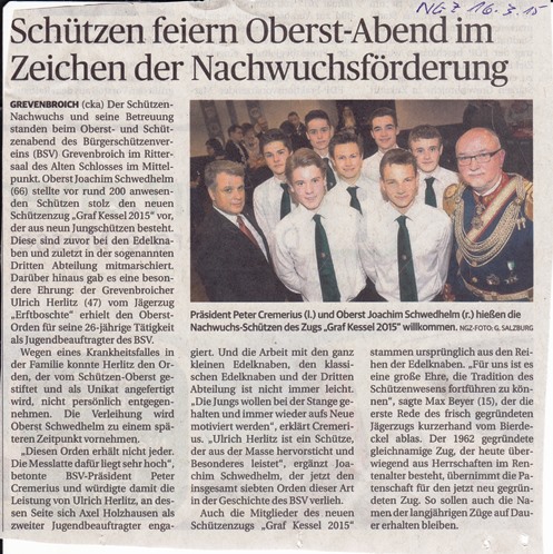 Am Oberst-Ehrenabend konnte ein stolzer Regimentschef Joachim Schwedhelm, selbst Mitglied im Jägerzug "Graf Kessel 1962", die Fortführung seines nunmehr über 40 Jahre bestehenden Traditionszuges bekanntgeben. Er stellte dem Regiment den Jägerzug "Graf Kessel 2015" als neuen Zug im Bürgerschützenverein mit acht jungen Schützen unter der Leitung von Max Bey vor.